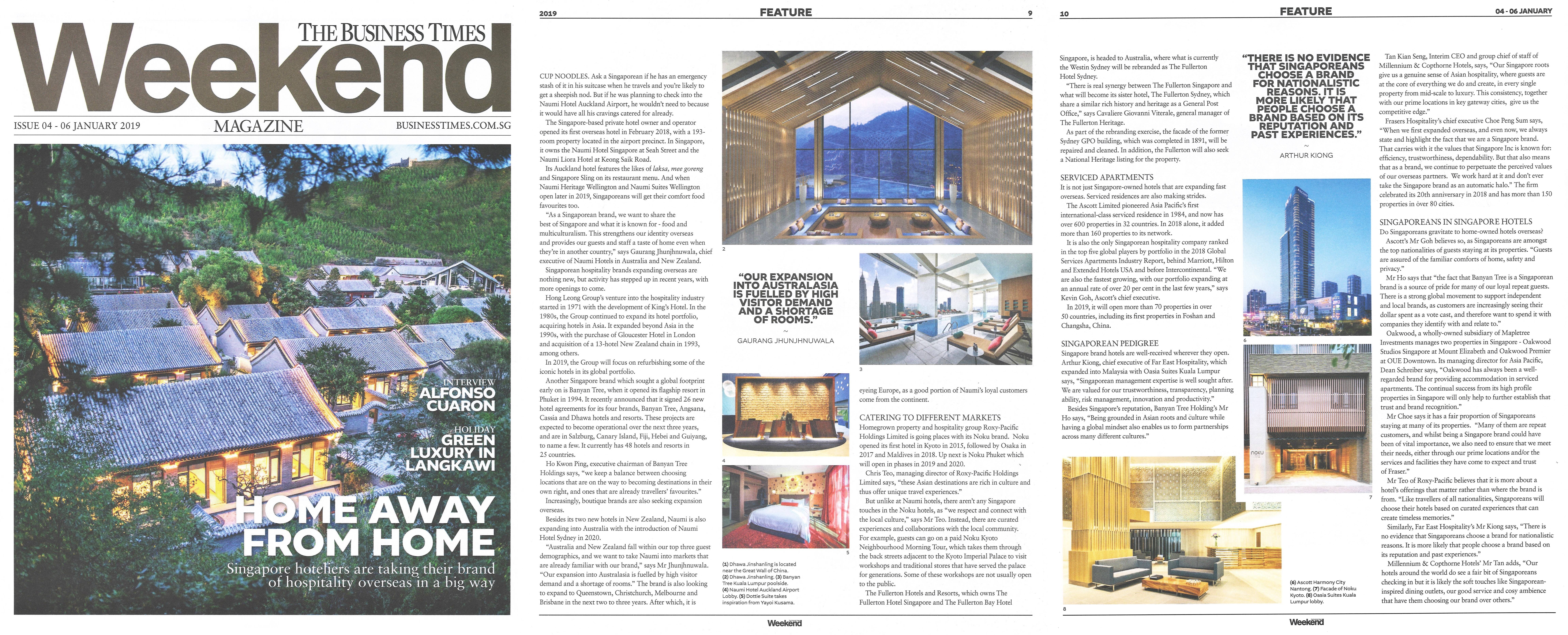 The story focused on Singapore hotel brands’ expansion overseas and Noku Hotels has been included. It was mentioned that homegrown property and hospitality group Roxy-Pacific Holdings Limited is going places with its Noku brand with the opening of its first hotel in Kyoto in 2015, followed by Osaka in 2017 and Maldives in 2018. Up next is Noku Phuket which will open in phases in 2019 and 2020.